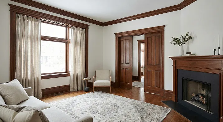 Единство создаётся через идентичность элементов. Все наличники одинаковой ширины (или пропорционально масштабу проёма), одного профиля (плоского), одного цвета. Чаще всего это белый или контрастный чёрный. Купить молдинги для стен из полиуретана плоского профиля — основа минималистичного обрамления.