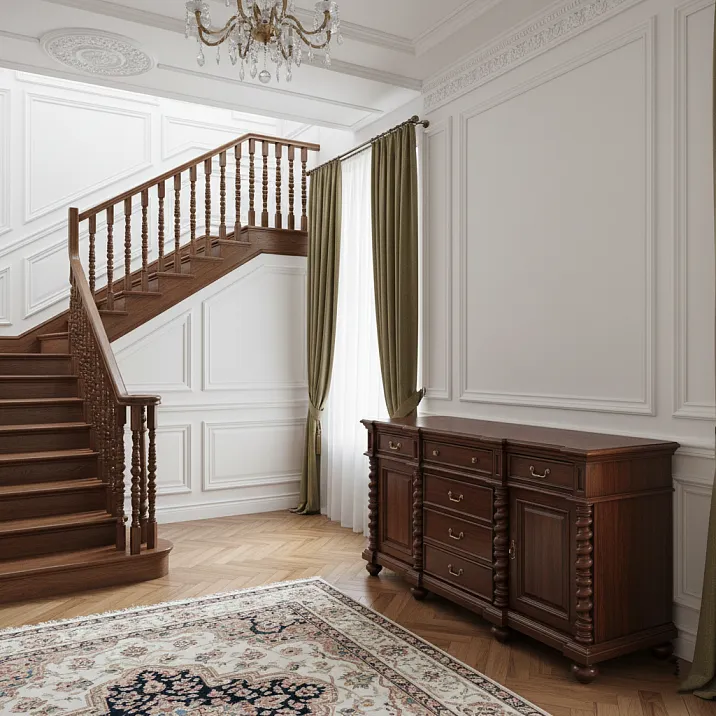 Лестница в двухуровневой квартире или загородном доме — это не просто путь между этажами. Это архитектурная доминанта, вертикаль, которая собирает пространство вокруг себя. Балясина деревянная, точёная из массива дуба с характерными перехватами, утолщениями, плавными переходами — это визитная карточка лестницы, её язык форм. Что если этот язык перенести в мебель, стоящую в том же пространстве? Когда опоры для мебели комода, буфета или консоли повторяют силуэт балясины, интерьер обретает редкую целостность — низ и верх разговаривают на одном наречии, мебель и архитектура становятся частями единой композиции. Это не декораторский трюк, а фундаментальный принцип классического дизайна, где каждый элемент связан с другими невидимыми нитями пропорций, ритмов, материалов.