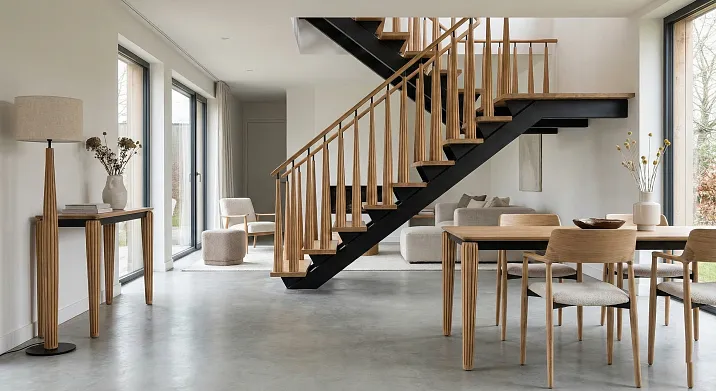 Современный минималистичный интерьер требует соответствующих решений. Квадратные балясины из светлого дерева логично дополнить прямыми квадратными ножками мебели. Никакого декора, только чистая геометрия, игра пропорций и фактуры дерева. Такая сдержанность создаёт ощущение спокойствия, порядка, функциональности.