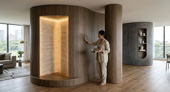 Проекты с несколькими поверхностями нестандартной геометрии, где отделка должна быть единой — от прямой стены к радиусной, от стены к колонне, от торца арки к откосу. Гибкая реечная панель обеспечивает визуальную непрерывность там, где другие материалы требуют смены формата или видимых переходов.