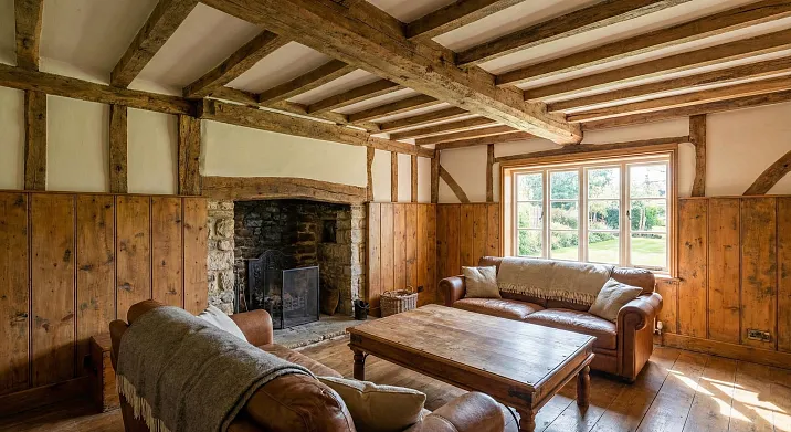 Деревянная отделка стен дополняет потолочные балки, создавая материальное единство интерьера.