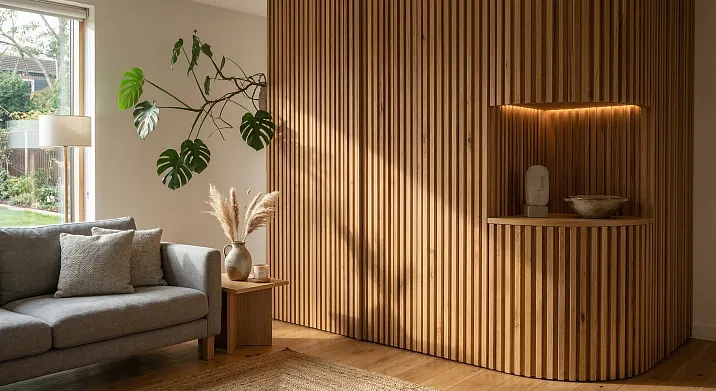 Гостиная — главная сцена деревянной реечной панели. Стена за диваном или у телевизора. Дуб с прозрачным маслом в тон паркету — это единство напольного и стенового материала, которое превращает гостиную в целостное архитектурное пространство.