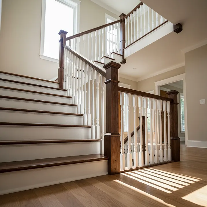 Сочетание разных пород дерева возможно, но требует тщательного подбора по цвету и текстуре. Дубовые балясины и ясеневый поручень могут гармонировать, если цвет подобран правильно. Но дуб и сосна контрастны по плотности текстуры, их сочетание может выглядеть неоднородно. Если сочетаете породы, лучше использовать окрашивание в один цвет, скрывающее различия текстуры.