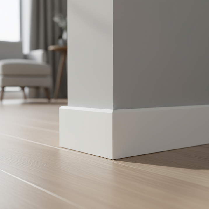 Простые прямоугольные плинтусы — базовый вариант для минималистичных интерьеров. Четкие геометрические линии, отсутствие декоративных элементов делают их универсальными для современных стилей. Высота таких плинтусов обычно составляет 40-80 мм.
