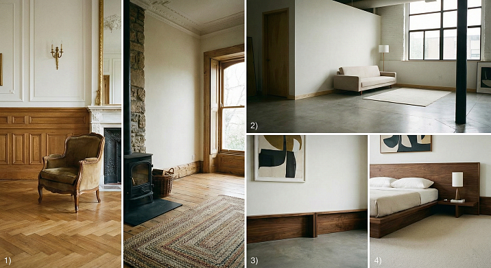 Профиль плинтуса задаёт стилистику. Простой прямоугольный профиль с фаской — минималистичная современность. Фигурный профиль с валиками и углублениями — классический стиль. Резной орнаментированный плинтус — историческая роскошь. Выбор профиля согласуется с общей концепцией интерьера.