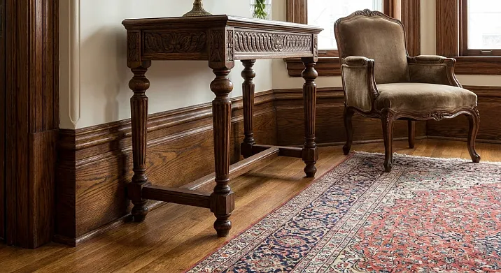 Плинтус, согласованный с мебелью — того же тона дуба, что и комод, буфет — создаёт материальное единство. Мебель воспринимается органично встроенной в архитектуру. Классическая мебель из тёмного дуба с плинтусом массив из того же дерева создаёт ощущение, что мебель и архитектура созданы одним мастером, в одно время, для одного пространства.