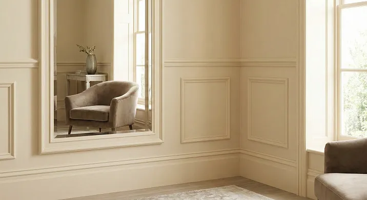 Молдинги: ширина 6-10 см, классический профиль, повторяющий мотивы плинтуса. Используются для создания стеновых панелей, обрамления обоев, декоративного зонирования.