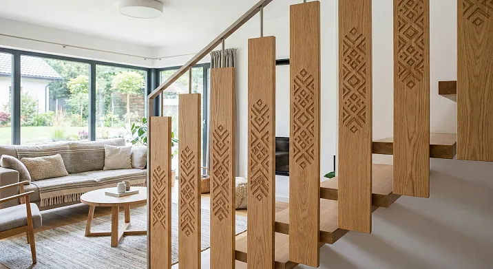 Что делает эти элементы столь особенными? Почему дизайнеры со всего мира вновь обращают взгляд на славянское наследие? В отличие от точёных балясин круглого сечения, которые пришли к нам из западноевропейской архитектурной традиции, плоские балясины представляют собой вертикальные доски, украшенные резьбой, прорезями или оставленные в своей лаконичной геометрической чистоте. Это выразительный, самобытный элемент, который позволяет создавать не просто ограждение лестницы, но целое художественное полотно, где каждая балясина — это часть единой композиции.