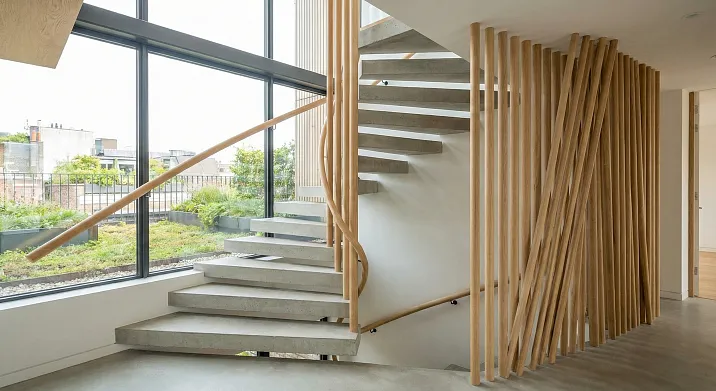 Материал имеет значение. Дуб придаёт лестнице основательность, весомость, подчёркивает статус дома. Бук мягче визуально, его светлый тон делает пространство легче, воздушнее. Ясень с его выразительной текстурой добавляет динамики, создаёт ощущение движения даже в статичной конструкции. Выбор породы зависит от общей концепции интерьера, но во всех случаях круглая форма сечения остаётся константой — проверенным веками решением.