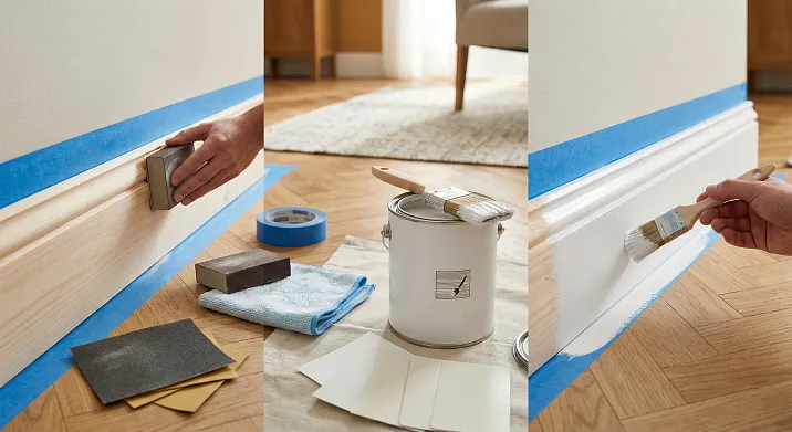 Исключение: покраска по месту, если плинтус уже смонтирован и снять его нельзя или нецелесообразно. В этом случае — тщательное маскирование пола и стены малярной лентой.
