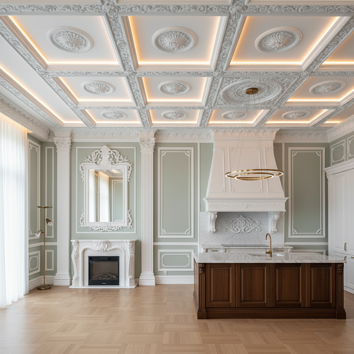 В кухне-гостиной полиуретан особенно уместен. Он не боится влажности от приготовления пищи, перепадов температуры от работающей плиты и духовки, легко моется от случайных брызг и загрязнений. При этом выглядит благородно - как настоящая гипсовая лепнина, но без ее хрупкости и тяжести. Давайте разберем, как использовать полиуретановые элементы в каждой зоне кухни-гостиной, создавая интерьер, где архитектура работает на функцию, а красота служит комфорту.