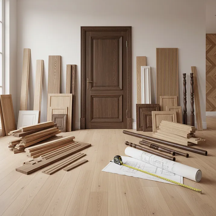 Комплектация полного набора деревянных изделий для ремонта начинается с детального проектирования. Составляется план помещения с указанием всех дверных и оконных проёмов, участков стен под декоративные рейки, мест установки панелей и багета. Для каждого элемента рассчитывается количество: наличники — 5 планок на одностворчатый проём, плинтусы — по периметру помещения минус ширина проёмов, рейки — исходя из площади стены и выбранного интервала.