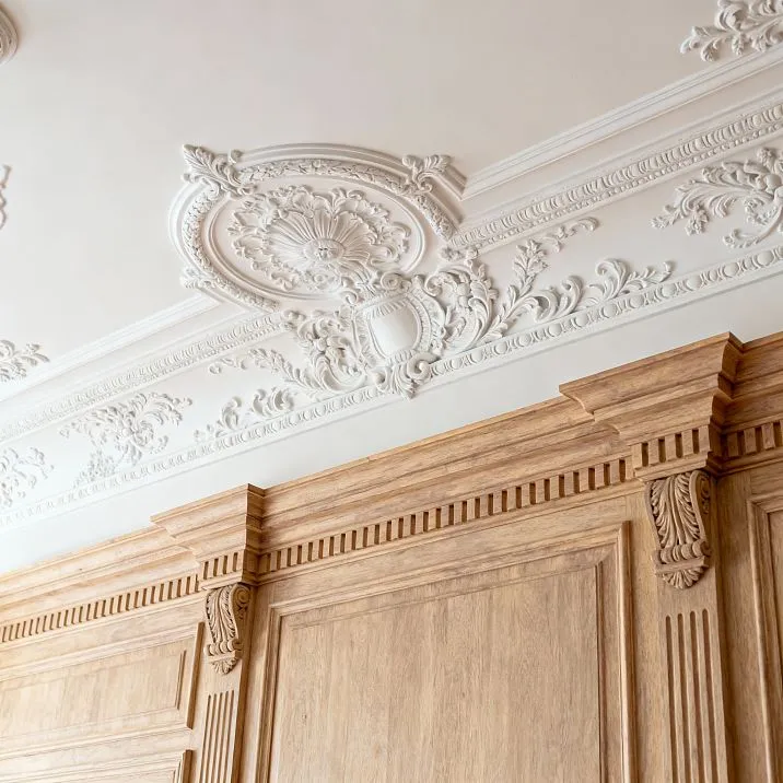 Гипс - традиционный материал для создания потолочной лепнины, использовавшийся столетиями. Гипсовая лепнина обладает благородной матовой поверхностью, четкостью деталей, способностью передавать тончайшие нюансы рельефа. С деревянным погонажом гипс сочетается идеально благодаря схожести в восприятии - оба материала ассоциируются с классическими интерьерами, ремесленным мастерством, традиционными ценностями.