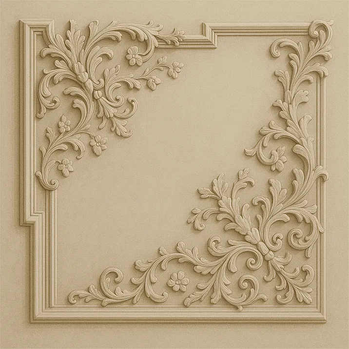 Сложные многоплановые композиции барокко с их театральной пышностью идеально подходят для демонстрации возможностей полиуретана. Розетки с амурами и гирляндами, карнизы с ракушками и завитками, декоративные панели со сценами из мифологии — всё это воспроизводится с музейной точностью.