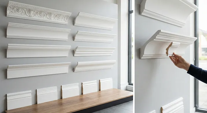 Полиуретан плотнее (280-350 кг/м³ против 25-40 кг/м³ полистирола), прочнее, рельеф четче. Полистирольные карнизы легче, дешевле, но хрупкие — ломаются при нажатии, крошатся при резке, рельеф менее детализирован. Полиуретан не ломается, режется без крошения, детали орнамента острые. Для ответственных интерьеров выбор — полиуретан. Для бюджетных проектов допустим полистирол при понимании ограничений качества.