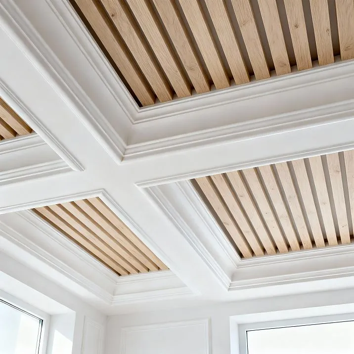 Потолок с потолочными молдингами из полиуретана и деревянными рейками превращается из пассивной плоскости в активного участника формирования пространственного опыта. Полиуретан создает архитектурное обрамление, структуру, классический декор при минимальном весе и легкости монтажа. Потолочные рейки из натурального дерева добавляют текстуру живого материала, ритмичную динамику, природную теплоту.