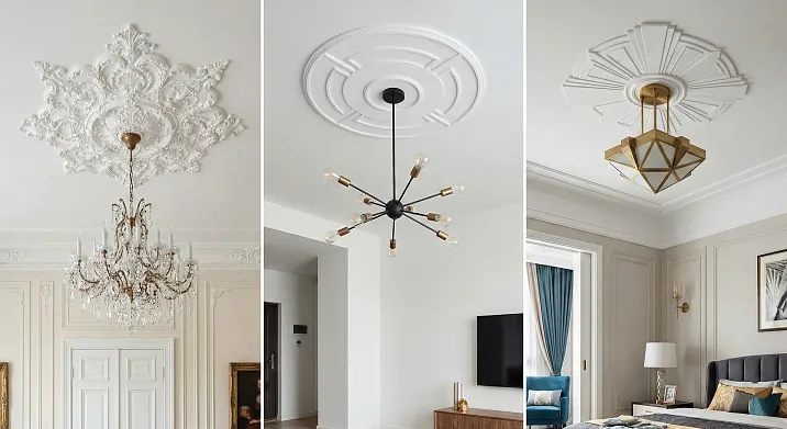 Технология монтажа на натяжные потолки расширяет применимость — розетки совместимы с самым популярным типом потолочных покрытий при соблюдении правил установки закладных платформ и использовании подходящих клеев. Варианты декорирования — от монохромной окраски до золочения и патинирования — адаптируют розетки под конкретные задачи: сдержанная элегантность или историческая роскошь, современная графика или антикварная стилизация.