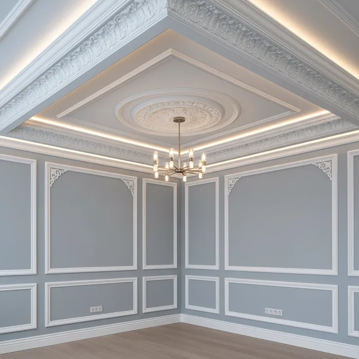 Это территория роскоши и экспериментов. Широкие карнизы 20-30 см, многоярусные композиции, богатая лепнина - все это уместно и работает на величие пространства. Можно комбинировать несколько типов декора: нижний плинтус, центральный молдинг, верхний карниз.
