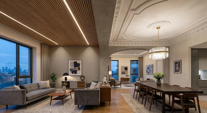 Потолок — не «пятый элемент», про который вспоминают в последнюю очередь. Это первый элемент, который задаёт масштаб всего пространства. Потолок из реечных панелей говорит о природе, о ритме, о тёплом дереве над головой. Лепной потолок говорит об архитектуре, о традиции, об архитектурном порядке, укоренённом в истории. И там, где они объединены — в карнизе с LED, в реечном «острове» в молдинговой рамке, в балках поперёк реек, — рождается что-то третье: интерьер, в котором каждое решение принято осознанно.