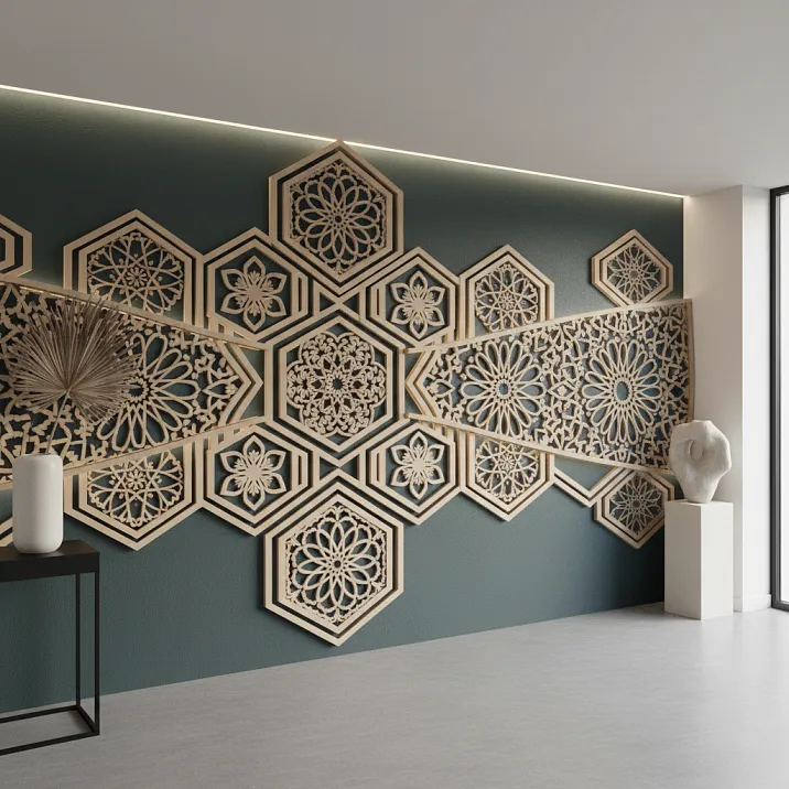 Декоративные панно и композиции - авторское направление. Раскладки различной длины, выложенные на стене в виде геометрических паттернов, создают объемные композиции с игрой света и тени. Комбинация раскладок из разных пород дает интересные цветовые сочетания. Вертикальные раскладки разной высоты образуют абстрактную скульптурную композицию. Такие панно становятся фокусными точками интерьера.