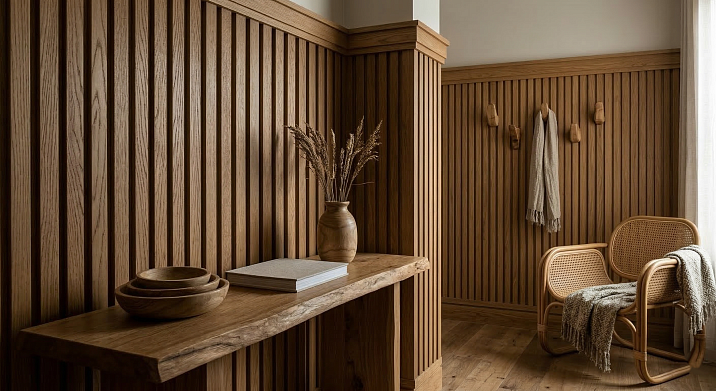 Молдинги из дерева — горизонтальные и вертикальные профили, делящие стену на поля. На стене без реечной панели — они создают структуру. На стенах рядом с реечной панелью — они переносят логику ритма с реечной поверхности на нейтральные стены.