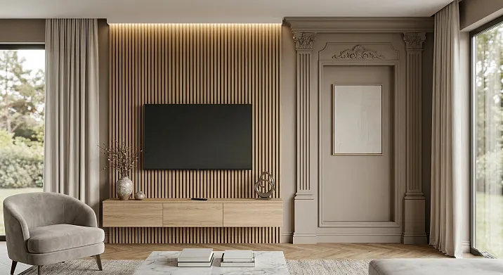 Современная неоклассика. Рейки из МДФ в тёплом белом или кремовом тоне. Молдинг-рамка из полиуретана того же тона — профиль с галтелью, тридцать-пятьдесят миллиметров. Угловые квадратные блоки. Телевизор в центре. Под ним — тумба в тон рейкам или с контрастной столешницей. Это решение, которое выглядит дорого и завершённо. Его не «перегружает» декор, не обедняет минимализм.