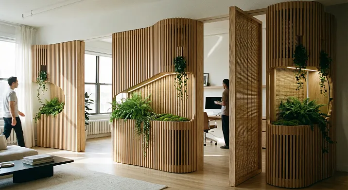 Природные палитры успокаивают, создают связь с землёй, лесом, камнем. Они сочетаются с натуральными материалами интерьера: деревянными полами, каменными столешницами, текстилем из льна, хлопка. Биофильная перегородка становится продолжением природной эстетики.