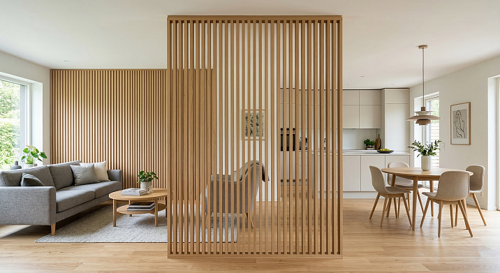 Принцип прост: реечная перегородка обозначает границу зоны визуально и тактильно, но не блокирует свет, воздух и зрительную связь между зонами. Человек в кухне видит гостиную сквозь рейки — но при этом ощущает, что находится в отдельной зоне.