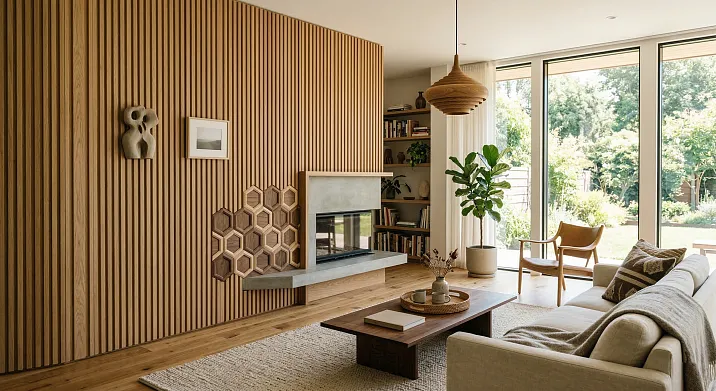 Реечные деревянные панели — это ритмический фон. Их задача: структурировать поверхность, создать деревянную «ткань» стены. Ритм рейки — регулярный, повторяющийся, спокойный. Именно эта регулярность делает рейку идеальным фоном для орнаментального акцента.