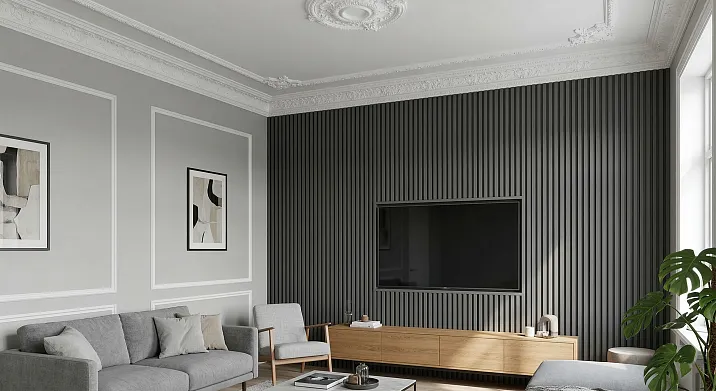 - Как лепнина из полиуретана дополняет строгую геометрию реечных МДФ-панелей