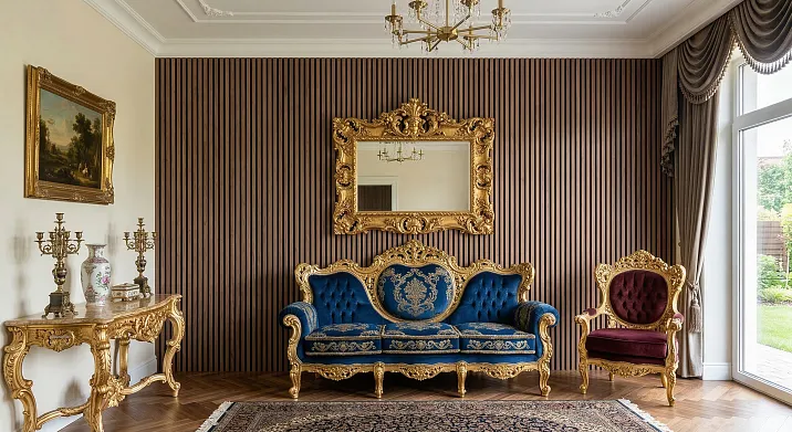 Рейка — это ритм. Повторяющийся, равномерный, успокаивающий. Именно эта ритмичность делает реечные стеновые панели идеальным фоном для сложной пластики барочной мебели.