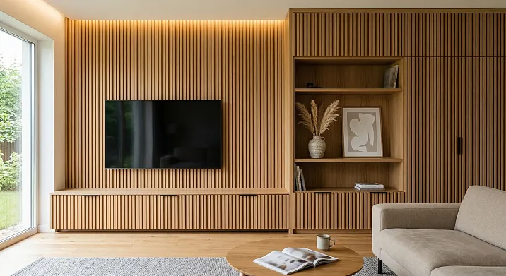 Решение: тумба с вертикальными накладными штапиками, шаг которых в два раза крупнее шага реек. Молдинг мебельный по верхней кромке тумбы — тонкий прямоугольный профиль — создаёт горизонтальную границу, визуально отделяя горизонтальный предмет от вертикальной стены. Открытые полки по бокам от ТВ — без молдинга: они дышат и дают паузу.