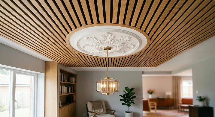 Потолок — это не просто перекрытие. Это пятая стена, которую большинство людей игнорирует, оставляя её белой, ровной и безликой. Между тем именно верхняя плоскость задаёт масштаб пространства, формирует его характер и определяет, будет ли интерьер запоминающимся или останется очередным типовым ремонтом. Когда в одном решении встречаются реечные панели из дерева на потолок и розетка полиуретановая — рождается архитектура, а не просто отделка. Две совершенно разные природы материала, два разных характера, и при этом — идеальный союз, который работает в спальне, гостиной, кабинете, детской и даже в прихожей с высокими потолками.