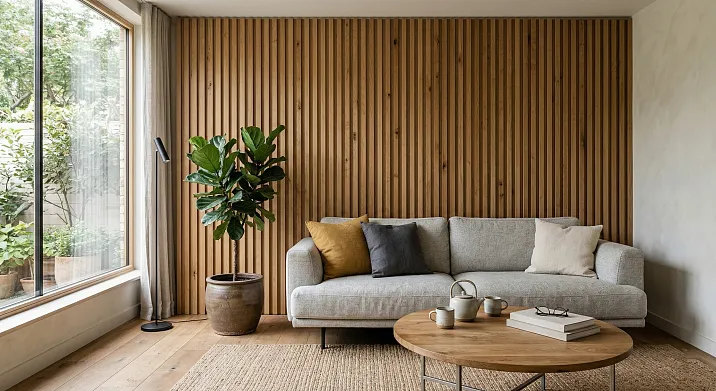 Гостиная — главное пространство жилого дома, и именно здесь реечная панель дуба раскрывается с наибольшей силой. Акцентная стена из дубовых реек за телевизором или диваном — это не просто декор. Это архитектурный жест, определяющий характер всего помещения.