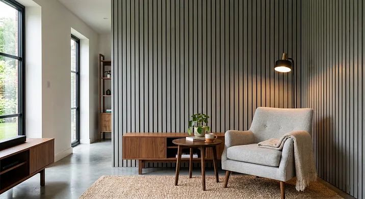 Реечные панели МДФ в графитовом тоне на акцентной стене позади дивана или рабочего стола — это сильнейший дизайнерский приём. Тёмная реечная стена поглощает свет, углубляет пространство и создаёт эффект сценической кулисы, на фоне которой всё остальное приобретает особую выразительность.