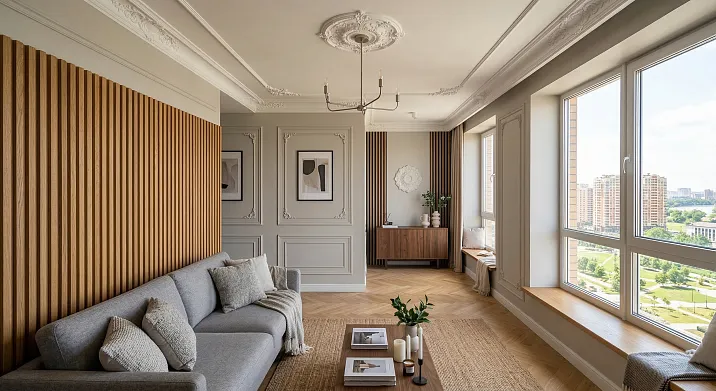 Вертикальные рейки из светлого ясеня на акцентной стене за диваном → карниз классического профиля с умеренным орнаментом по периметру потолка → молдинги, разбивающие потолок на три поля → потолочная розетка над люстрой. Все элементы декора — в белом тоне, рейки — в натуральном тёплом цвете.
