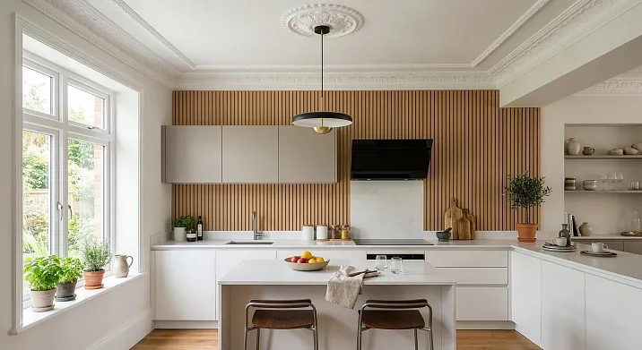 Противоречие решается выбором правильных материалов и правильными зонами применения. Реечные стеновые панели и лепной декор на кухне — это не про «везде». Это про «там, где нужно» и «там, где будет работать».