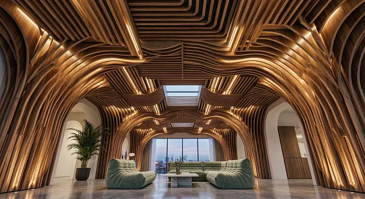 Гибкие реечные панели на потолок особенно востребованы в коммерческих пространствах с нестандартной архитектурой: ресторанные зоны с арочными сводами, лобби с криволинейными перекрытиями, торговые пространства с дизайнерскими потолочными объёмами.
