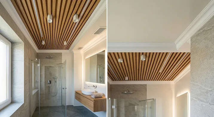 Разные решения с разными плюсами. Натяжной потолок из ПВХ: максимальная влагостойкость, простой монтаж, широкий выбор фактур. Реечный потолок: натуральная или натуральноподобная фактура, тёплый визуальный характер, архитектурная выразительность. При правильном выборе материала и монтаже реечный потолок в ванной — эстетически значительно богаче натяжного.