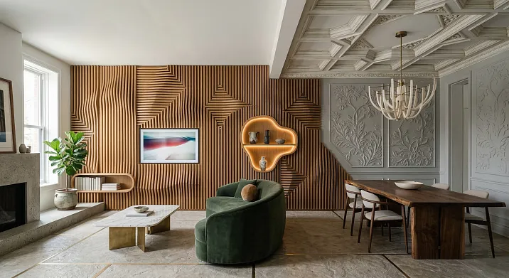 Реечная стена — живая, ритмичная, природная — должна «говорить» первой. Полиуретановый декор создаёт для неё архитектурный контекст, задаёт координаты, организует переходы. Это диалог, в котором у каждого участника своя роль.