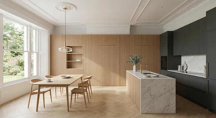 Где в кухне уместны реечные панели: зонирование без компромиссов