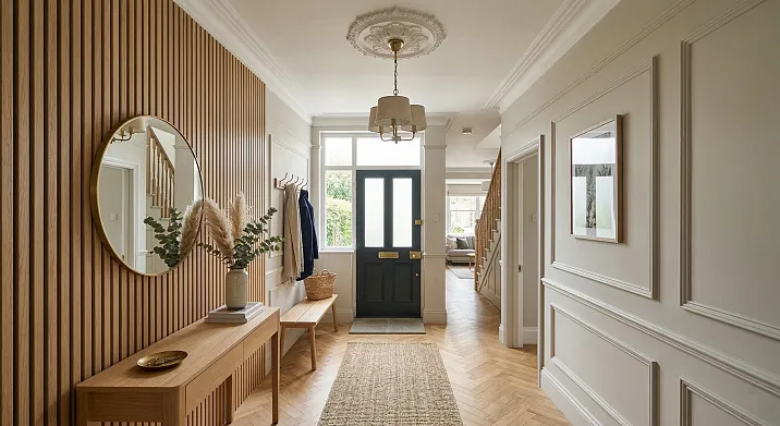 Реечная панель только в зоне входа (от входной двери до 1,5–2,0 м вглубь квартиры) — и затем нейтральная отделка в коридоре. Граница между реечной зоной и нейтральной: вертикальный молдинг из декоративной лепнины — тонкая вертикальная полоса, обозначающая переход.