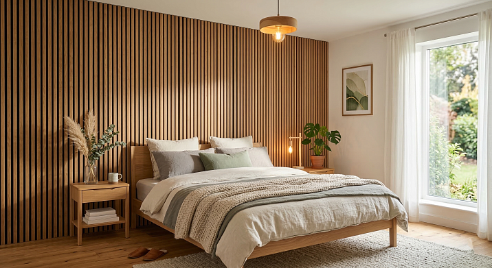 Горизонтальные рейки «расширяют» и «опускают» пространство. В спальне с потолком ниже 2,8 м — только вертикальные рейки. Горизонталь — для просторных спален от 3,0 м в высоту.