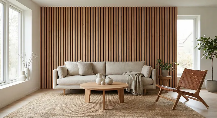 Гостиная — сердце дома, место сбора семьи и приёма гостей. Акцентная стена с рейками за диваном или в зоне телевизора создаёт фокусную точку, структурирует пространство. В открытой планировке рейки могут служить визуальным разделителем между гостиной и столовой зоной, не создавая физического барьера.