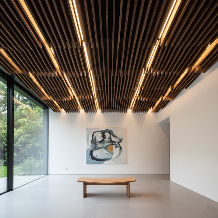 Применение премиальных реек ориентировано на престижные интерьеры, где важен представительский вид и долговечность. Акцентные стены в гостиных и кабинетах, реечные потолки в загородных домах, мебельные фасады класса люкс, лестничные конструкции. Натуральная красота дуба или ясеня подчеркивается прозрачными маслами или лаками.