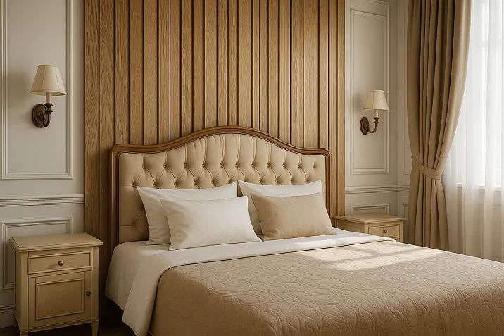 Неоклассические интерьеры используют декоративные рейки МДФ для создания современной интерпретации традиционных панелей. Благородные оттенки дуба, ореха, красного дерева в сочетании с классическими пропорциями формируют атмосферу аристократической элегантности.