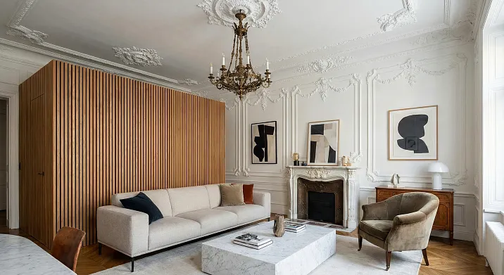 Как объединить несовместимое? Как заставить работать вместе минималистичные деревянные рейки — символ современного скандинавского дизайна — и классические полиуретановые молдинги, пришедшие из дворцовых интерьеров XVIII века? Как создать пространство, где геометрия реечной отделки соседствует с орнаментальностью лепнины, где современная мебель не конфликтует с архитектурными обрамлениями, где каждый элемент усиливает другой? Ответ лежит в эклектике — осознанном смешении стилей, эпох, материалов, основанном на глубоком понимании пропорций, цвета, композиционных законов. Сегодня разберём, как купить деревянные рейки для декора стен и молдинги из полиуретана, как их смонтировать, как создать комплект материалов для эклектичного интерьера, который не стыдно показать гостям и профессиональным дизайнерам.