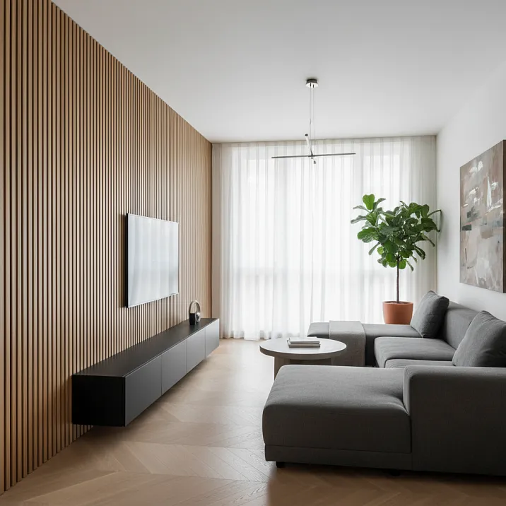 Философия минимализма находит идеальное воплощение в использовании деревянных реек как единственного декоративного акцента интерьера. Чистые линии, естественные цвета и простые формы создают пространство, где каждый элемент имеет функциональное значение и эстетическую ценность.