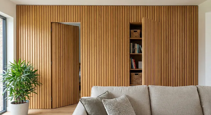 Встроенный шкаф за реечной стеной — полноценная система хранения глубиной 400-600 миллиметров, скрытая за сплошной реечной облицовкой с доступом через скрытые двери — создаётся в нише помещения, алькове, между двумя стенами, за фальш-стеной. Внутреннее наполнение стандартное — штанги для вешалок, полки для сложенной одежды, выдвижные ящики для белья, аксессуаров. Фасад — реечная панель или несколько панелей на скрытых петлях или раздвижных направляющих, визуально неотличимые от стены. Закрытые — шкаф невидим, стена выглядит декоративной. Открытые — доступ к содержимому, функция обнаруживается.