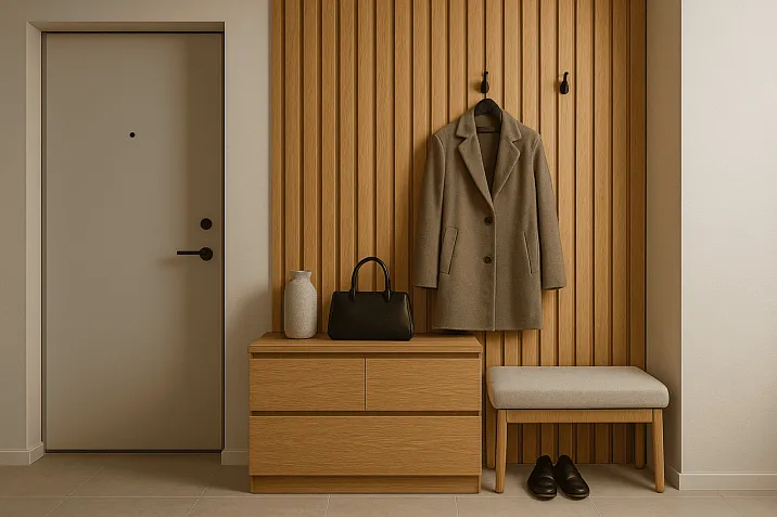 Дубовые рейки прекрасно подходят для изготовления мебели и мебельных фасадов. Шкафы-купе с реечными дверцами выглядят легко и современно, при этом сохраняя связь с природными мотивами. Использование различных направлений реек — вертикального, горизонтального, диагонального — позволяет создавать уникальные композиции.